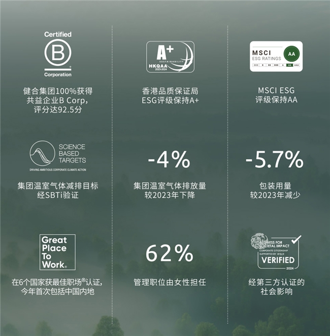 健合集团全球100%实体提前一年获B Corp共益企业认证。B Corp作为评估企业的社会和环境影响力及治理的严格认证之一,健合以92.5分的优异成绩,证明已将社会与环境责任深度整合至企业运营的各个层面,为推动商业发展模式转型树立标杆。
