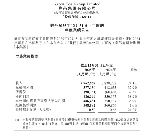 2025年,对于中国餐饮行业而言,是充满挑战与分化的一年。在整体消费环境承压、行业竞争白热化的背景下,市场呈现出鲜明的结构性特征:盲目扩张者显疲态,而具备强大运营韧性、清晰商业模式与核心竞争力的企业则逆势上行。近期,中式餐饮领先品牌绿茶集团(6831.HK)发布了2025年度业绩报告,以营收和经调整净利润分别大幅增长24%、41%的亮眼数据,为市场注入一剂强心针,也为其“高质量增长”的叙事提供了有力注脚。